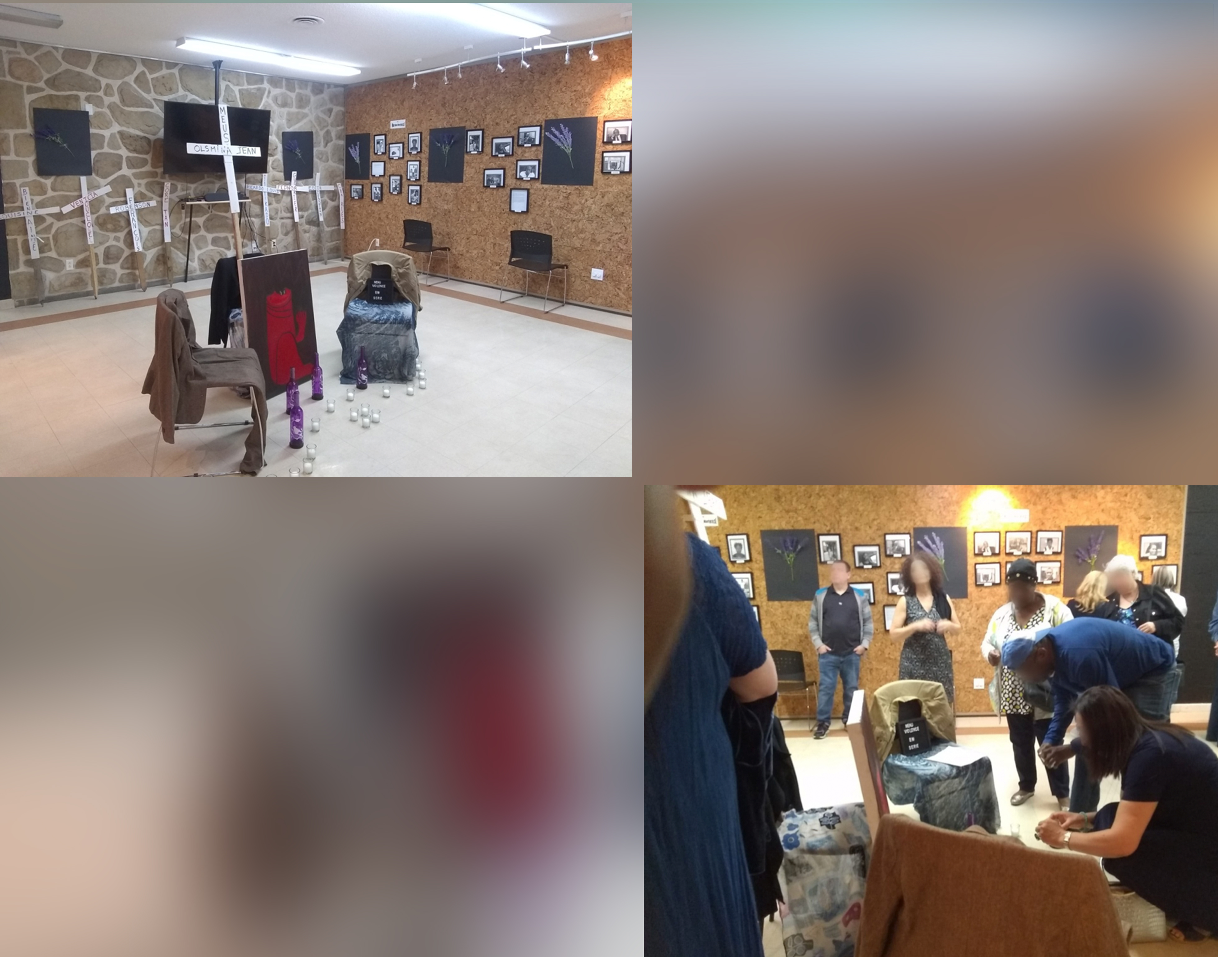 En partenariat avec le Centre d’éducation et d’action des femmes de Montréal (CEAF), la Coalition haïtienne contre la dictature en Haïti (CHCDH) a organisé une exposition de photos en hommage à plusieurs milliers de personnes violemment assassinées depuis le mois de novembre 2018 en Haïti. L’exposition a eu lieu dans la grande salle de CEAF le jeudi 25 mai 2023 entre 17h et 19h située au 2422 Boulevard Maisonneuve à Montréal. Ayant pour titre « Murs des Martyrs », l’exposition consiste essentiellement à revêtir les murs de la salle de plusieurs dizaines de photos de personnes assassinées, de croix portant le nom des victimes et de textes poétiques adaptés à la circonstance. Fixées dans un encadrement noir, les photos sont toutes en noir et blanc.
