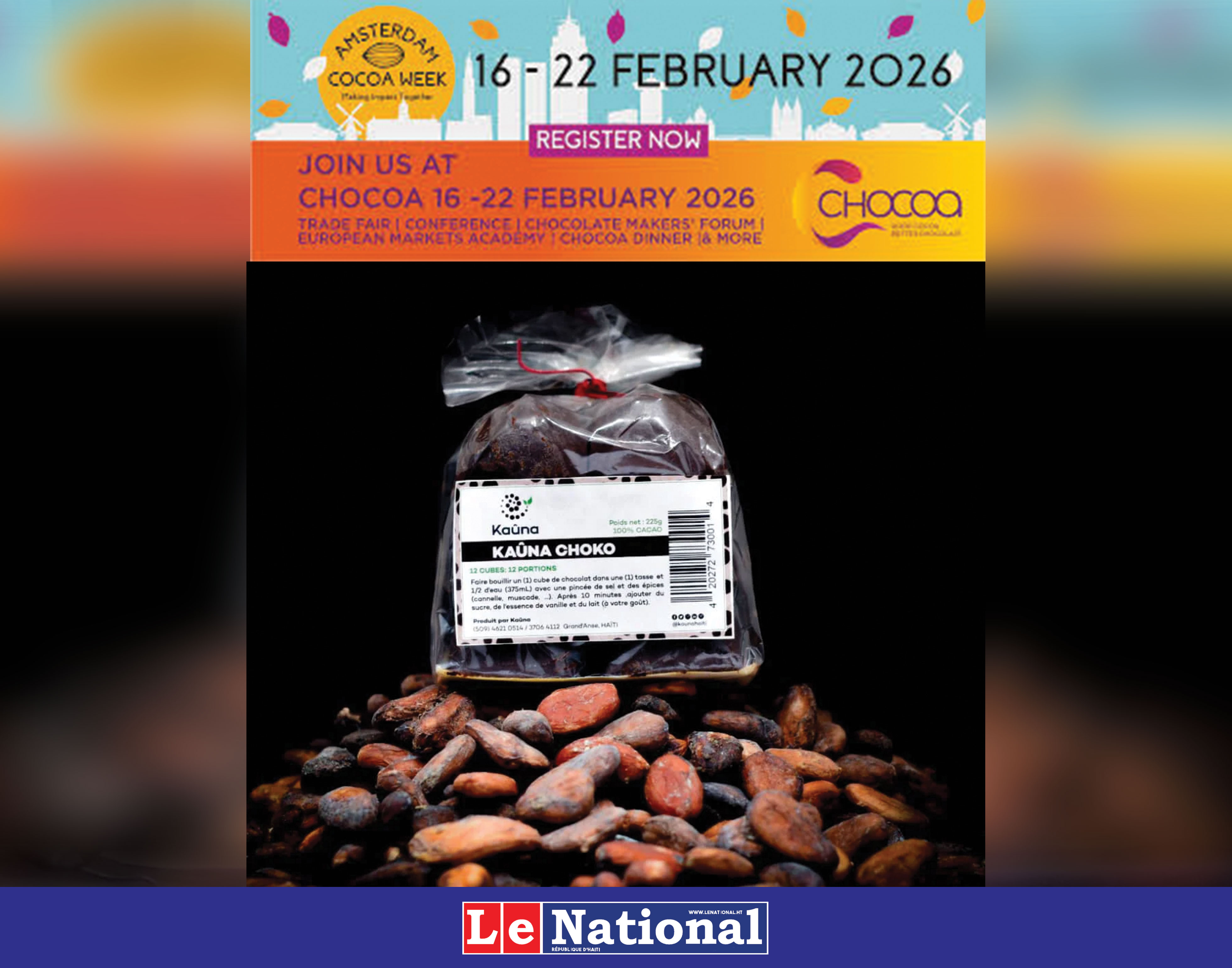 Après une participation remarquée au Salon du Chocolat de Paris en novembre 2025, Kaûna poursuit sa dynamique de promotion et de structuration du cacao haïtien à l’international. Dans cette même lancée, l’entreprise haïtienne participera à CHOCOA Amsterdam du 16 au 22 février 2026, l’un des rendez-vous majeurs mondiaux dédiés au cacao durable, à la qualité et à l’innovation dans la filière chocolatière.