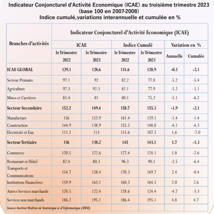 Le ministère de l’Économie et des Finances (MEF) et l’Institut haïtien de Statistique et Informatique (IHSI) ont présenté le tableau indicateur conjoncturel d’Activité économique (ICAE) au cours du troisième trimestre de 2023. Ils ont par ailleurs soulevé que l’Indice global de l’ICAE-Haiti a connu un recul en glissement annuel de 0.3% et des secteurs comme l’agriculture, les activités de fabrication, la construction, les activités extractives, les hôtels et les restaurants ont un impact négatif sur l’ensemble des activités économiques.