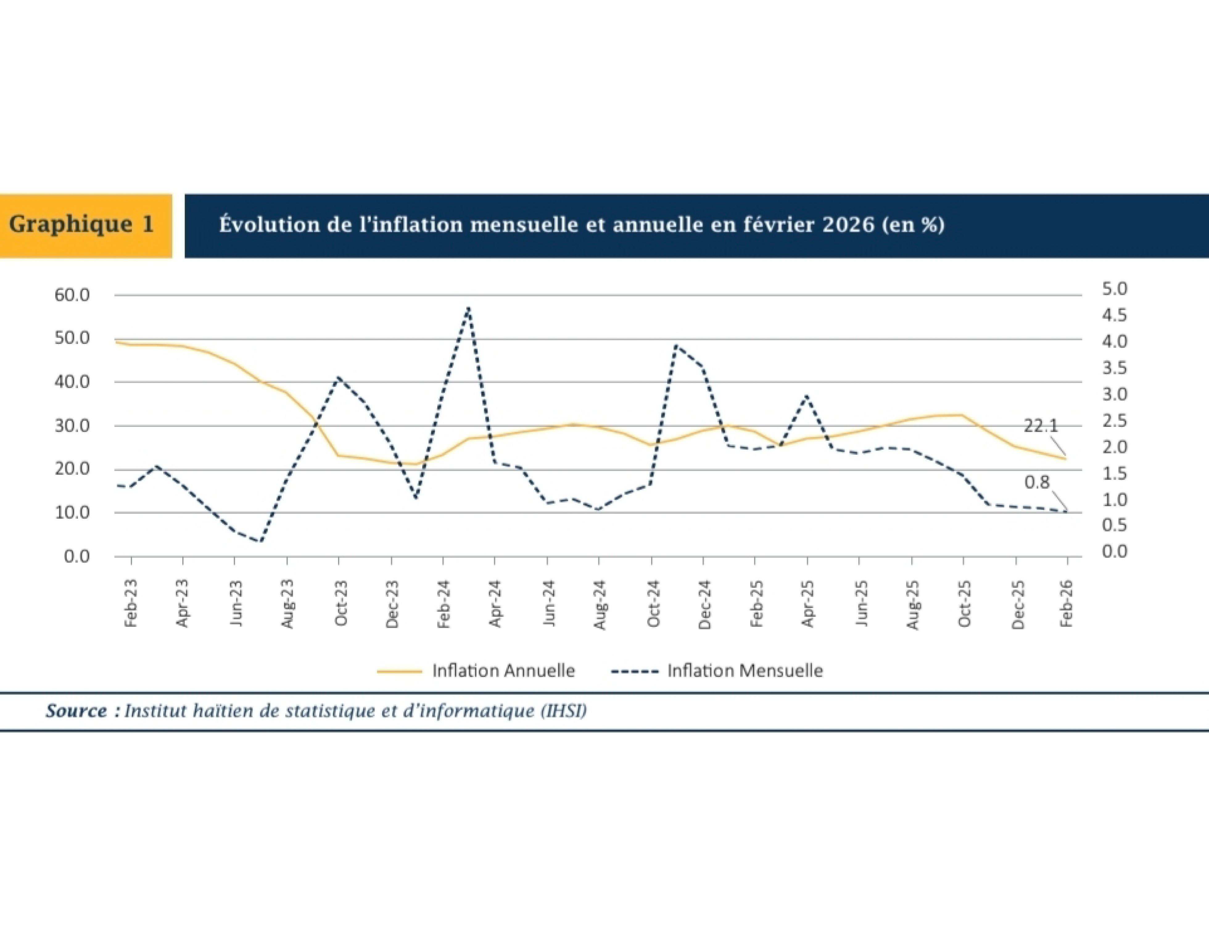 La Banque de la République d’Haïti (BRH) a publié sa note mensuelle d’inflation pour le mois de février 2026, confirmant la poursuite de la tendance à la désinflation observée depuis novembre 2025. Selon l’Institut haïtien de statistique et d’informatique (IHSI), l’indice des prix à la consommation (IPC) a progressé en février 2026 de 0,8 % en variation mensuelle, contre 0,9 % en décembre 2025 et janvier 2026. En glissement annuel, l’inflation s’est établie à 22,1 %, soit un recul de 1,5 point par rapport à janvier 2026.