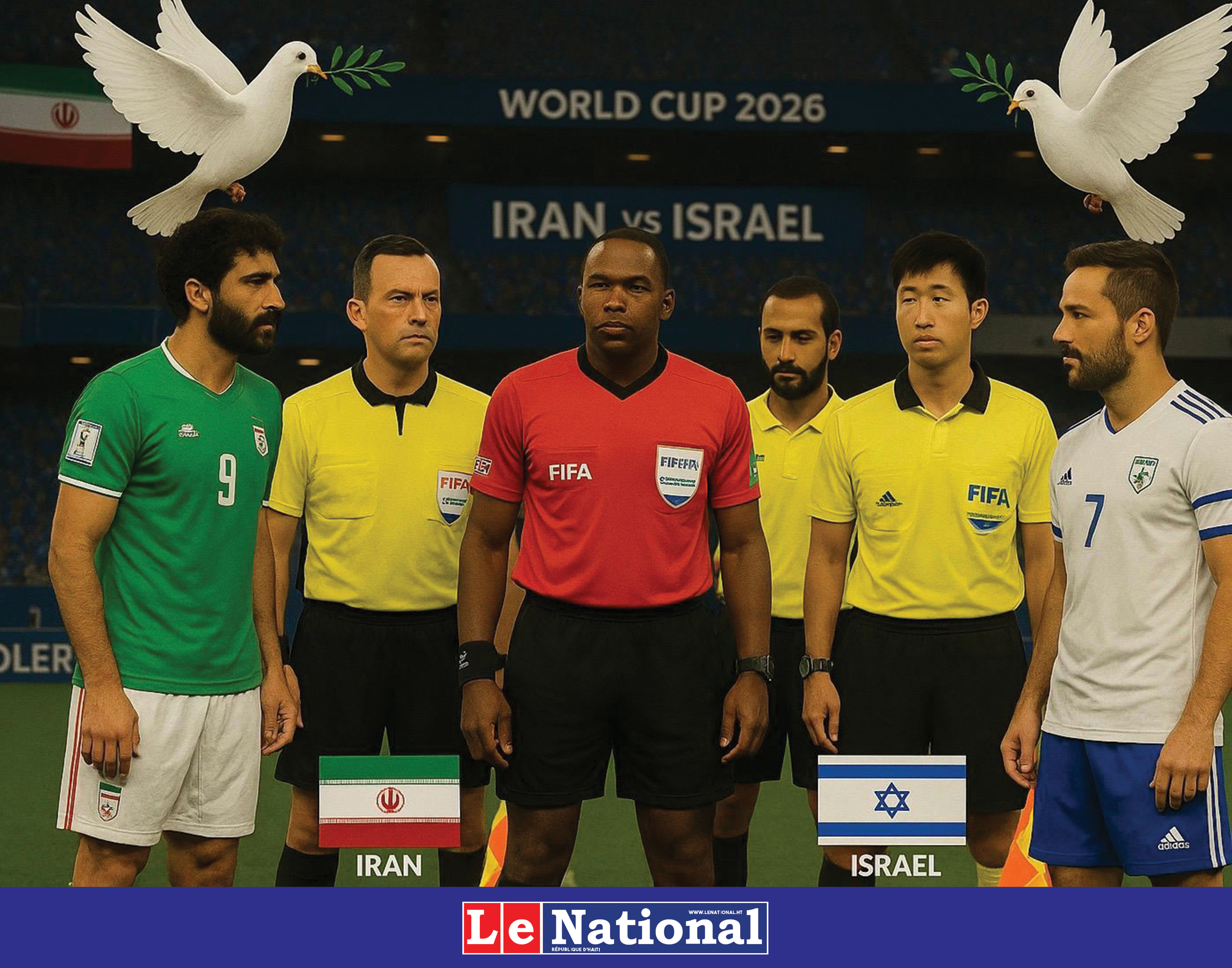Il est 18h50. L’air vibre d’une tension historique dans les tribunes, où drapeaux israéliens et iraniens flottent côte à côte sous les projecteurs. L’arbitre américain d’origine haïtienne, Donald Love, ajuste son brassard devant des joueurs israéliens et iraniens échangeant sourires timides, mais regards perçants. À ses côtés, un juge de ligne russe Vladimir Ivanolov et un chinois Xi Liwèli vérifient leurs drapeaux, tandis que le quatrième arbitre saoudien, Khalid Abibi scrute l’horloge. Dans la cabine VAR, une équipe composée de deux (2) ukrainiens et de deux (2) palestiniens chuchotent.