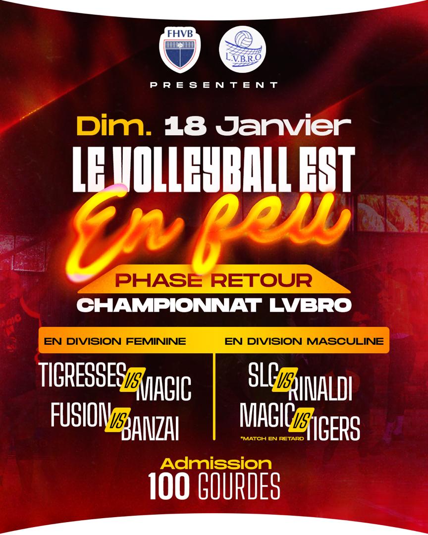 La deuxième moitié du championnat de volleyball de la saison régulière, organisé par la Ligue de Volleyball de la région Ouest (LVBRO) au gymnase Ayiti Cheri (Delmas 75), débutera ce dimanche 18 janvier 2026 avec trois matchs : deux chez les femmes et un chez les hommes.